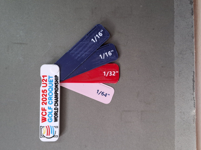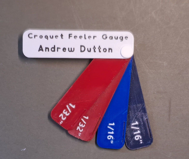 PLA plastic feeler gauge with four feelers of 1/32", 1/32", 1/16", 1/16" allowing thicknesses of 1/32", 1/16", 3/32", 1/8", 5/32", 3/16". The accuracy of the thickness it to within 1/1000". Size 75mmx20mmx8mm. Bespoke thicknesses and colours and monogram can be provided to specific order.