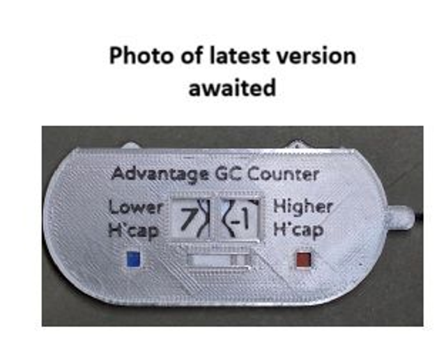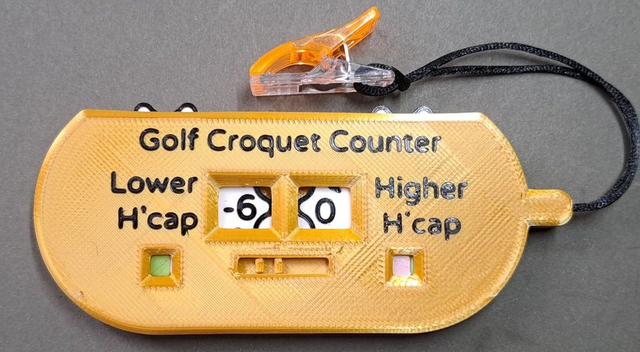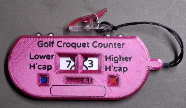 Standard Flat Counter with the addition of a slider which can be adjusted to show the combinations of the ball colours being played. Combinations of blue/red, red/blue, green/pink, pink/green. Can be dismantled, by undoing two screws so that the numbered wheels can be replaced with wheels with revised number combinations should the WCF change the system. Go to spare wheels. Clip included. Length 100mm excluding clip Height 44mm Thickness 7mm excluding clip. For personalised version please state name to be added in 'Message for Merchant' at the Shopping Basket stage