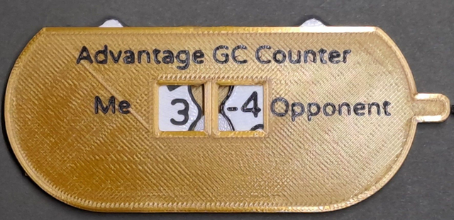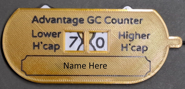 Gold Advantage Croquet Counter for aiding players in remembering the score. There are two wheels with numbers from -6 to 7 which can be rotated one click at a time to record the score. A ratchet prevents the numbers changing by accident. This latest version is future proofed. It can be dismantled by undoing two screws. The numbered wheels can then be replaced with wheels with revised numbers, should the World Croquet Federation decide to change the numbering system. Go to spare wheels. Can be hung from clothing using the clip provided. For personalised version please state name required in 'Message for Merchant' at the Shopping Basket Stage.