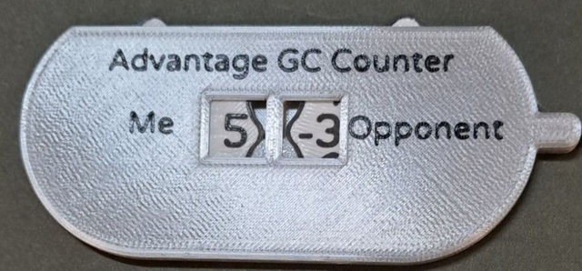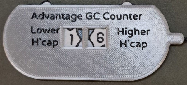 Gold Advantage Croquet Counter for aiding players in remembering the score. There are two wheels with numbers from -6 to 7 which can be rotated one click at a time to record the score. A ratchet prevents the numbers changing by accident. This latest version is future proofed. It can be dismantled by undoing two screws. The numbered wheels can then be replaced with wheels with revised numbers, should the World Croquet Federation decide to change the numbering system. Go to Spare Wheels. Can be hung from clothing using the clip provided. For personalised version please state name required in 'Message for Merchant' at the Shopping Basket Stage.