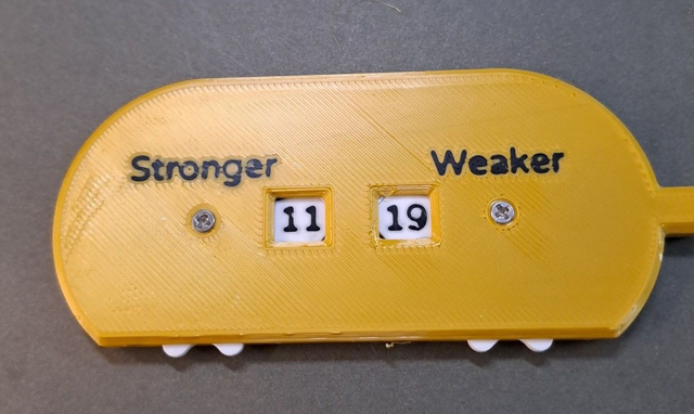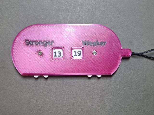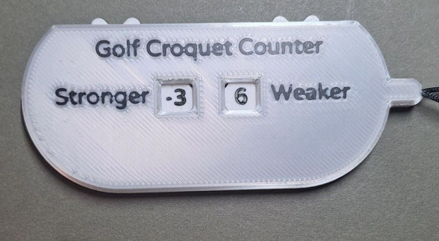 Golf croquet counter with the numbers running from -6 to 20 to cater for both starting score and target score Advantage GC as well as 13 point and 19 point level games. The numbers run from -6 to 7 on the front face, then flip over the counter and the numbers continue from 7 to 20. Available in three colours. Other colours to special order.